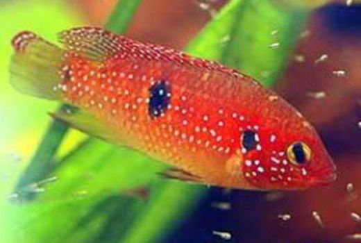 De naam zegt het al, de acara is mooi rood gekleurd, in de paartijd is het mannetje nog feller rood. Op het midden van hun lichaam en achter de kop zit een zwarte stip. Het geslachtsonderscheid is moeilijk te zien. In de handel worden ze ook weleens aangeboden als H. lifalili.