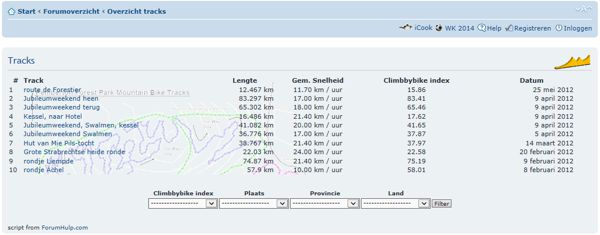 Tracks shows a nice overview of all tracks / routes you have created. A selection filter helps you to find the right track and will be remembered throughout your session on your website / forum. A link to the correct forum to discus with your belongs to the overview. Together with our mod trackBB an ideal combination.
